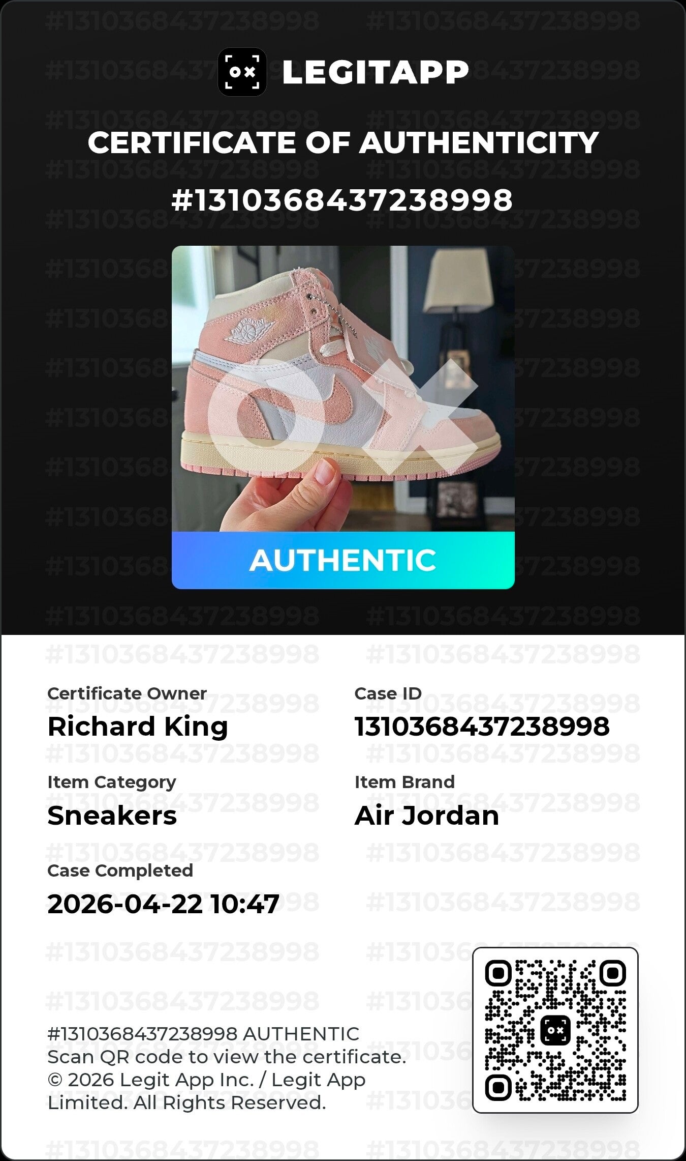 Jordan 1 Retro High OG "Esshed Pink"Size 5.5WPre owned No BoxPrice does not include shippingFill out the form on the Contact & FAQ page for more info and to purchase
